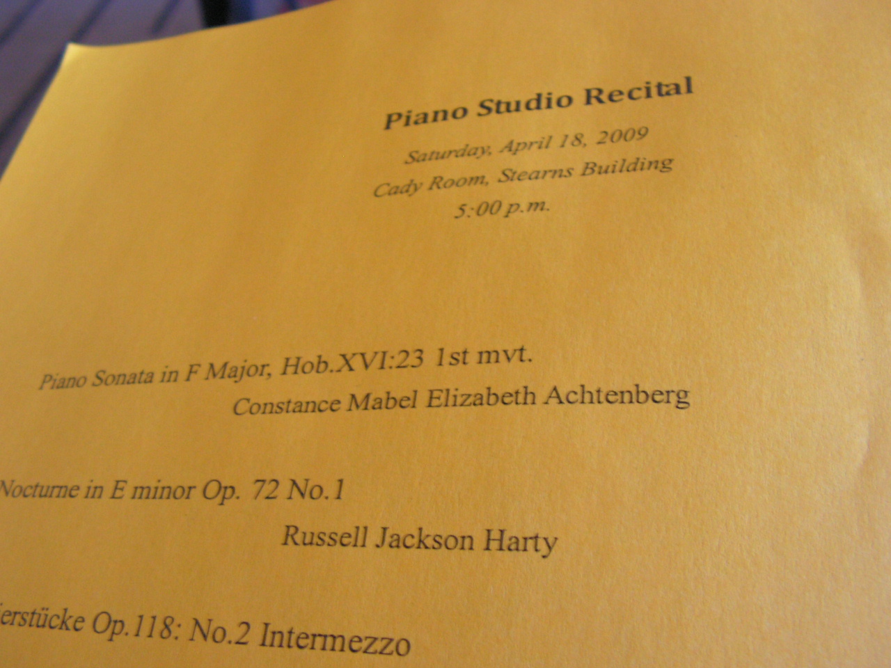 Piano Recital Saturday, April 18, 2009 Cady Room, Stearns Building 5:00p.m. |